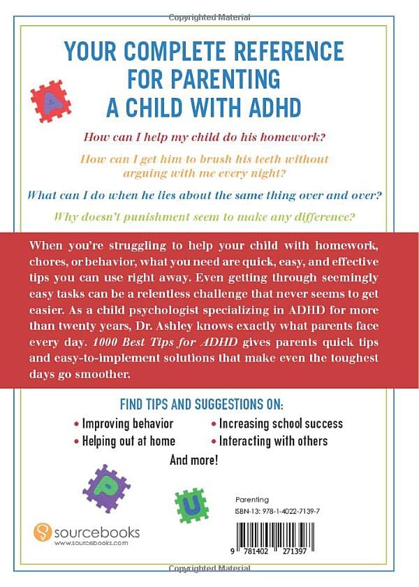 When you’re struggling to help your child with homework, chores, or behavior, what you need are quick, easy, and effective tips you can use right away. Even getting through seemingly easy tasks can be a relentless challenge that never seems to get easier. As a child psychologist specializing in ADHD for more than twenty years, Dr. Ashley knows exactly what parents face every day. 1000 Best Tips for ADHD gives parents quick tips and easy-to-implement solutions that make even the toughest days go smoother.