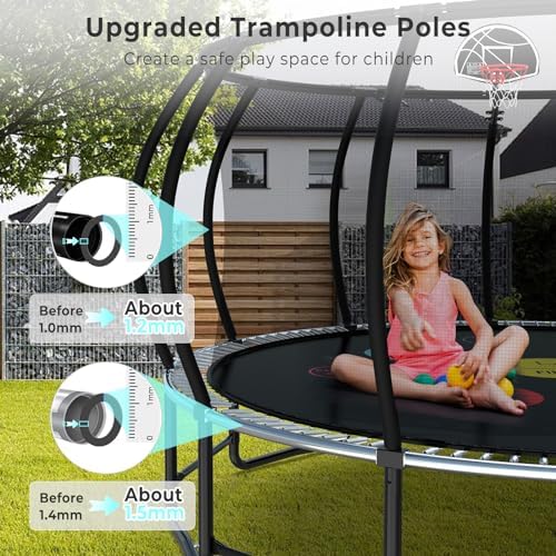 【Uncompromised Safety】 Our trampoline features innovatively designed curved poles for comprehensive protection. Along with a 360° all-encompassing safety net, it guarantees unparalleled safety for your children, ensuring a worry-free jumping experience