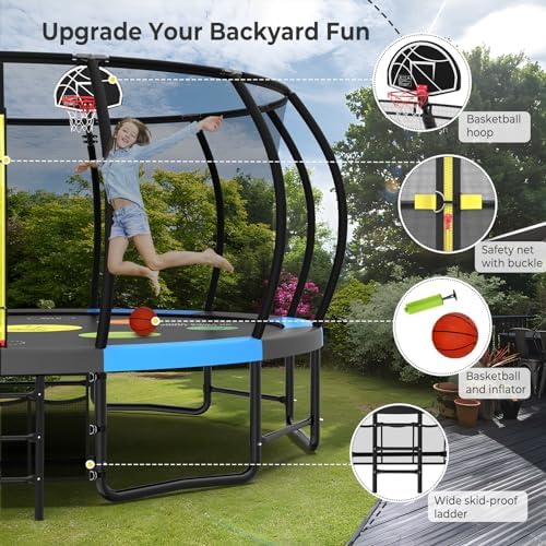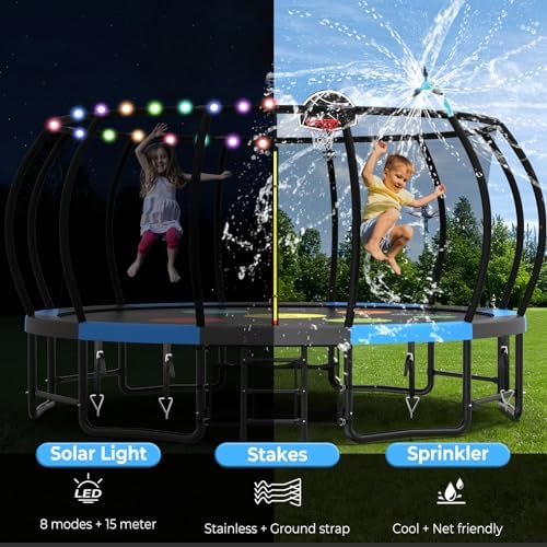 【Comprehensive Trampoline Kit】 Elevate the fun with our 12ft trampoline, complete with an array of accessories: sturdy ground stakes, a refreshing trampoline sprinkler, vibrant LED lighting, and a basketball set with pump. This bonus package promises endless laughter and entertainment
