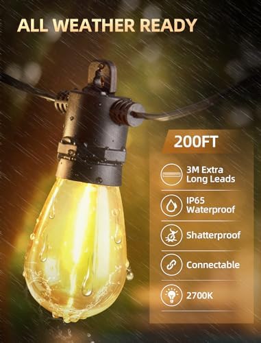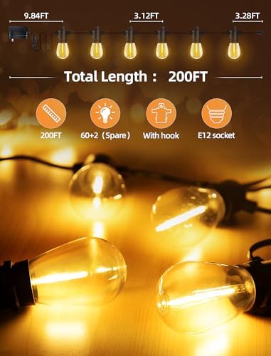 【Energy-Saving & Safety】Outdoor String Lights are 200 feet in total length with 3.11 feet bulb spacing, 9.84 feet lead length, 60+2 (spare) shatterproof S14 bulbs and 1 remote control. Outdoor lights for yard use an e12 socket base and use LED technology to save energy and last longer than traditional tungsten bulbs!