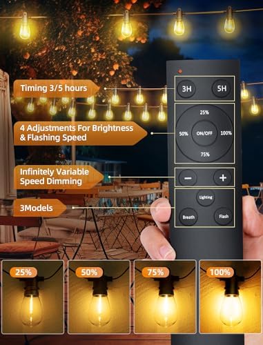 【3 Lighting Modes & Timer Function】: UIONVO upgraded edison string lights for outside have 3 lighting modes for you to choose from: Lighting, Breath, and Flash. you can create the desired ambience and change it according to your mood or occasion. 3/5H Timer to turn off automatically, saving the hassle of manually unplugging to turn off the lights.