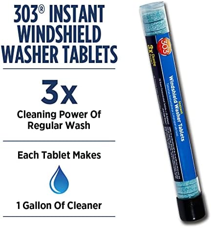303 Instant Windshield Washer Tablets are formulated to completely remove road film, dirt and grime leaving windshields sparkling clean. Each super-concentrated tablet makes up to 1 gallon of windshield cleaner. Simple, drop tablet in reservoir of clean water or add tablet to a gallon of water. Non-toxic, biodegradable, safe for rubber and paint.