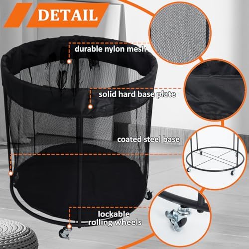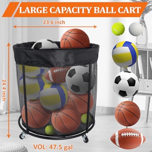 【Space-Saving】: 47.5-gallon large capacity ball cart with wheels, with dimensions approximately H 24.4in x Φ23.6in. This ball organizer can store balls, toys, and other sports items in one bin, which helps you save space and keeps your activity area clean and organized.