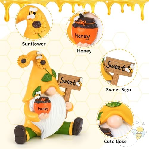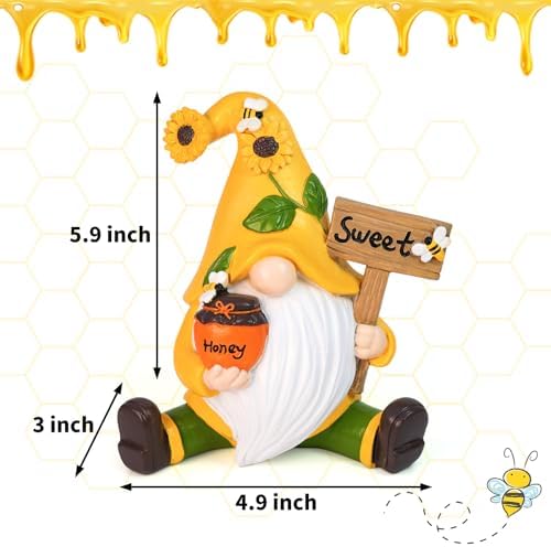 【Bee Decor Figurines】 This Bee gnome is made of non-toxic and odorless resin, have bright yellow colors and cute appearance,one hand holding a honey jar, the other hand holding a sweet sign with a lovely bumble bee ,the hat decorated with sunflower and an adorable bee,which adds spring and summer atmosphere, perfect bee figurines gnomes decor bumblebee decor spring summer decorations tiered tray decor gnomes garden decor ,surely add a unique summer atmosphere to you.