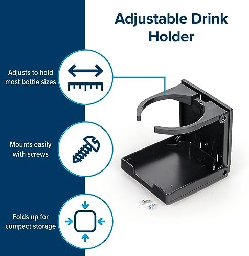 Camco’s RV/Marine Adjustable Drink Holder provides a convenient place to hold your drink inside your RV, car, van, truck or boat. This holder features adjustable arms to hold most bottles, cans or mugs that are up to 3 ½-inches in circumference. Folds up for compact storage. Product installs easily using the (4) provided screws. Color: black.