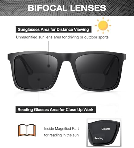 ★SUNGLASSES WITH READERS BUILT IN▶ Reader and Sunglasses in One for near and far vision. Perfect for Outdoor Reading and Distance Viewing and No More Carrying Multiple Pairs of Glasses! Wearing our bifocal reading sunglasses, you can read, play with mobile phones and laptop freely outdoors without compromising visibility or comfort. Suit for driving, fishing, vacation, barbecue, summer party, etc.