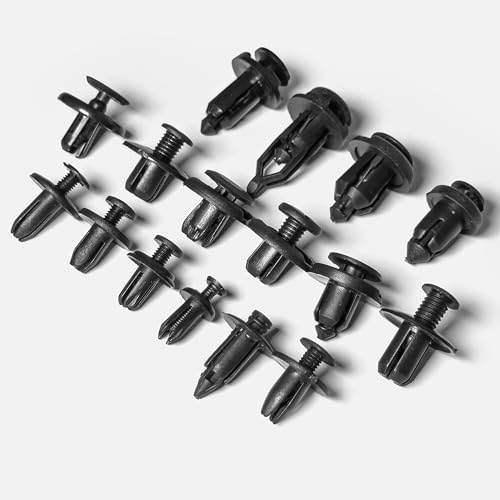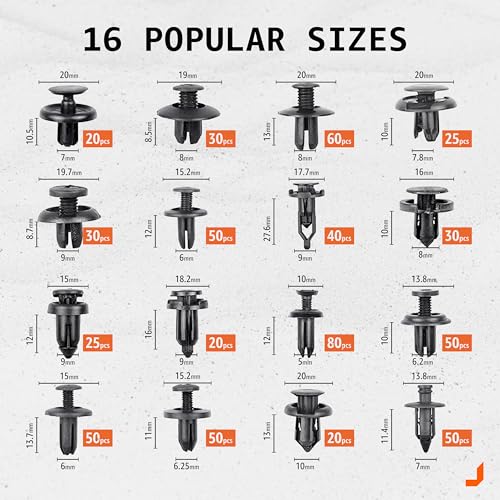 NIVERSAL FIT KIT: – Great assortment push retainer kit with 16 most popular size, fitting for door trim, radiator shield yoke, fender, bumper, side skirt, grille, engine cover and splash shield retainers replacement,compatible with Ford, GM, Chrysler, Toyota, Honda and more. All packed in a plastic container for easy organization and storage.