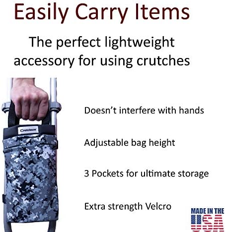 Easy to install the crutches bag. Simply attach to your crutches with Velcro and you’re ready to go. If you need even more space, you can attach one crutch bag to each crutch. Made in USA.