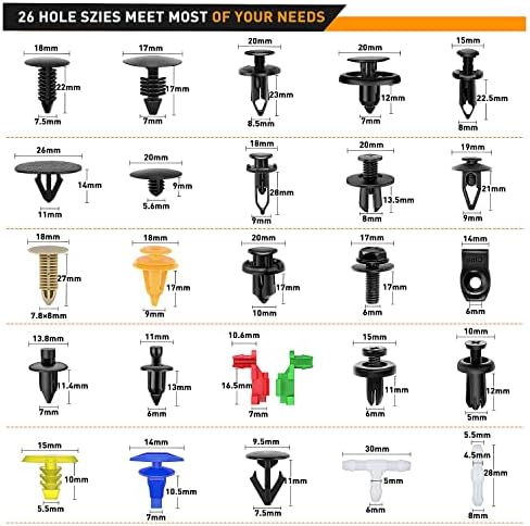Universal Fit Kit:The kit contains 26 types of most common sizes of fastener clips, suitable for the OEM replacement in 5-11mm hole sizes,that you’ll always have the right size