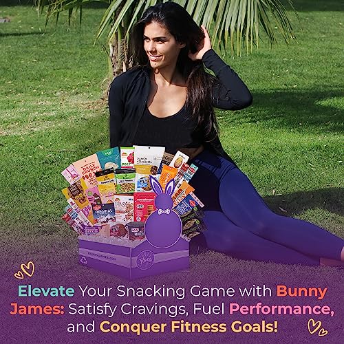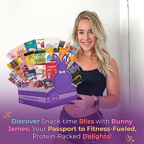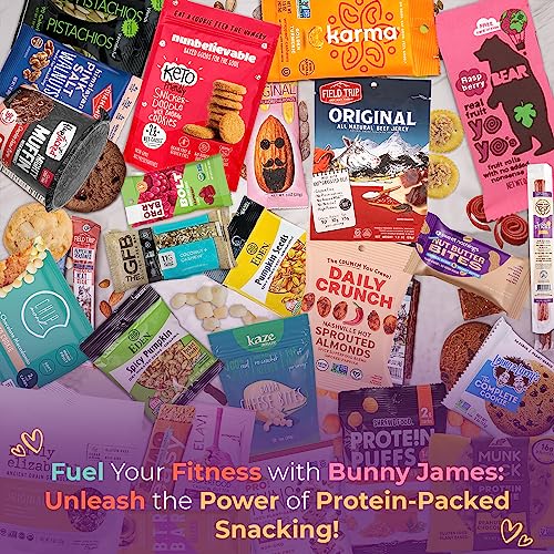 HEALTHY HIGH PROTEIN SNACKS GIFT BOX: The Bunny James Fitness Box (30 Count) is the ultimate healthy snack assortment filled with 30 full size individually wrapped single serve nutrition snacks.