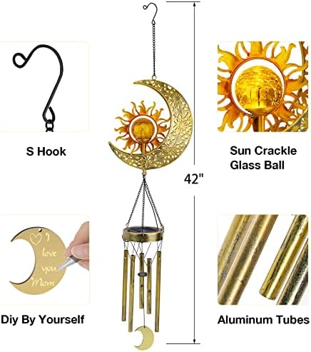 🌙Unique Design – Our LED solar light wind chimes designed into the shape of the moon. Being made of the premium material makes the Unique windchimes waterproof. Retro moon crackle glass ball wind chimes is composed of premium metal top with S hook, led light surrounded by the Sun shape frame and 5 bronze waterproof aluminum tubes. The beautiful wind chimes design spice up your garden, Garden, Yard, Patio and Lawn.