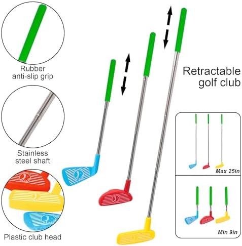 Unique Design: with three retractable toddler’s golf clubs ( Driver, Iron, Putter ), it is suitable for 3 to 5 years old kids of different heights. Through market research, our design team reinforced the interface of the telescopic golf club to make it more durable.