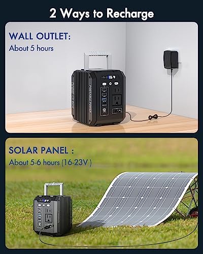 🔌MULTI-OUTPUT: This portable power station is equipped with 2 AC outlets(2 prongs & 3 prongs) which is compatible with the appliances such as TV, gaming console, mattress pumps. And there are 5 DC output ports which are 2*USB A(5V/2A, 15W Max), 1*USB A(18W, QC3.0), 1*USB C(18W PD) and 1*DC(12-16.8V/10A, 13A Max). These would provide stable and safe power for laptop, smartphone, tablet, camera, drone, CPAP, which is suitable for camping, RV, fishing, hunting, hiking, emergency or power outage.