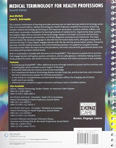 Use a proven combination of learning principles and exercises to make learning medical terminology easier . Now in its 7th Edition, MEDICAL TERMINOLOGY FOR HEALTH PROFESSIONS simplifies the process of memorizing complex medical terminology by focusing on the important word parts — the common prefixes, suffixes and root words — to provide a foundation for learning hundreds of medical terms. Organized by body systems, the chapters begin with an overview of the terminology related to the body’s structures and functions, then proceed through diseases and disorders, and finally diagnostic procedures and treatments. This helps students master the necessary language to describe how the human body works, what goes wrong with it, and how we treat it. Every chapter engages learners with the See and Say pronunciation system, interactive exercises, real life medical scenarios and critical thinking exercises. An updated art program includes illustrations that reflect the latest terms and procedures, and multi-cultural /multi-generational photos that accurately portray today’s medical world. Built-in multimedia is included with the text on the StudyWare CD-ROM. This resource is packed full of activities that engage student with games, quizzes, animations, and an audio glossary -ultimately helping students study , prepare for exams, and achieve success .