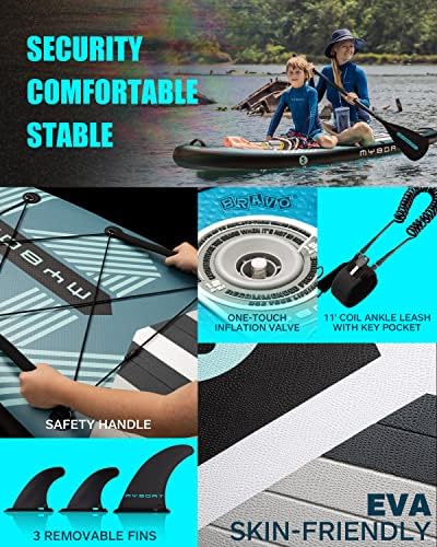 【COMPLETE PADDLEBOARD KIT & 24H SERVICE】All professional accessories: safety leash, hand pump, 3 removable fins, length-adjustable strong paddle, mobile phone waterproof bag, 5L dry bag. Stand up inflatable board is perfect for professional athletes, sea sports enthusiasts, beginners, elder players, and youth. MYBOAT offers 1 year warranty for your order, if any questions, please feel free to contact us!