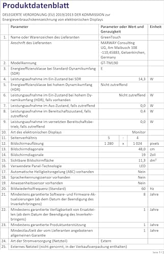The display size 430mm(W) x355mm(H),Thickness: 47 mm Color Black Display type Active matrix TFT LCD , LED backlight Resolution 1280 X 1024 @ 60HZ Display colors 16.7M Brightness 250cd/m² Contrast ratio 1000 : 1 Power External DC, input voltage DC12V View angel (from center) L/R:85/85;U/D:80/80 (Typ.)(CR≥10) Sweep frequency Horizontal: 31.5 – 60.2 kHz; vertical: 56.3 – 75 Hz Mounting options 100mm or 75mm VESA mounting,open bracket mounting Certification UL,cUL (Recognized), FCC, CE, CB, RoHS Operation temperature 0°C to 40°C Storage temperature -20°C to 60°C Operating Humidity 20% to 80% RH (no condensation) Storage Humidity 10% to 90% RH