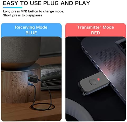 【Easy to Use & Plug and Play】Simply press the middle round button to quickly switch transmitter / receiver mode. Instant setup, just plug and play. Powered by USB, don’t worry about running out of power when listening music or watching tv. Red Light means TX Mode while Blue Light means RX Mode.