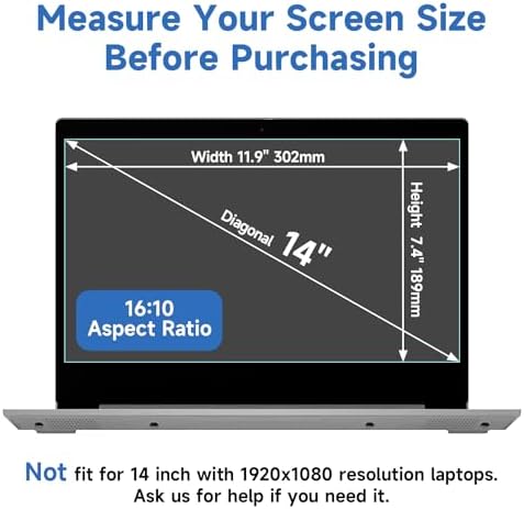 【Perfect Compatibility】This laptop screen protector 14 inch is specially designed to fit all brands of 14-inch laptops with a 16:10 aspect ratio (Not Fit for a 16:9 resolution laptop. If you’re not sure, contact us to confirm it for you!). The diagonal measurement of the screen is 14 inches (measured viewable display area diagonally, corner to corner without the frame), and the filter size is 11.9 inches (30.2cm) x 7.4 inches (18.9cm). You’ll enjoy a perfect fit for your laptop screen.