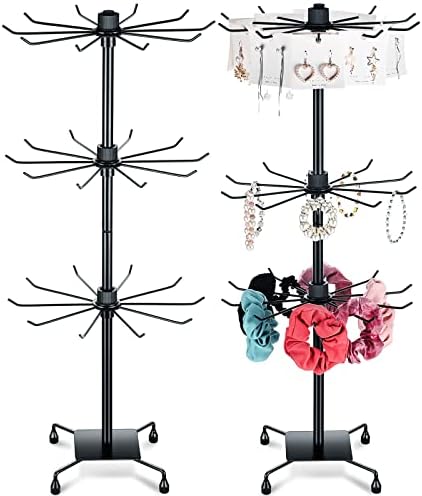 2 Pcs Rotating Display Stand Jewelry Display Rack with Hooks Metal Earrings Display Stands for Selling Necklace (Black, 3 Tires)