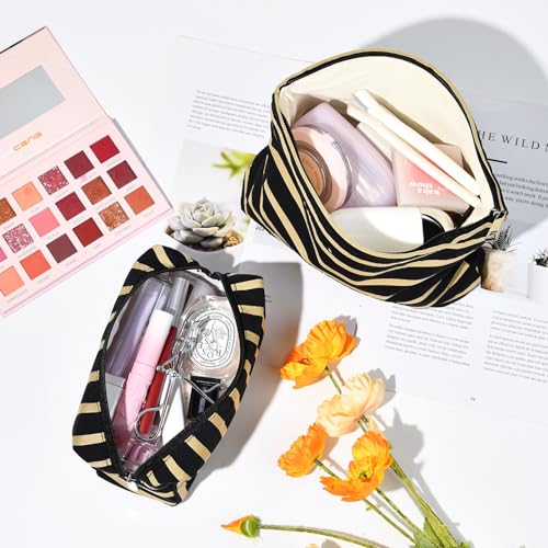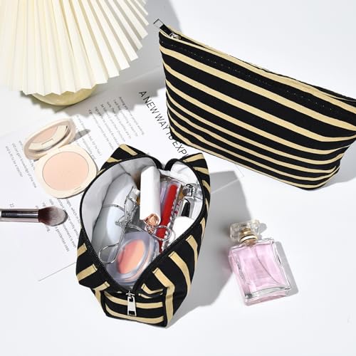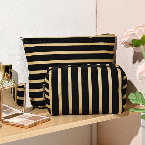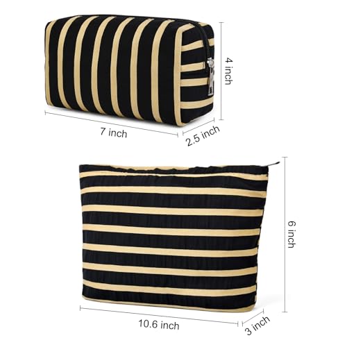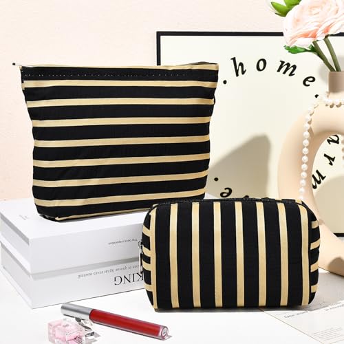 2 Pieces Makeup Bag Large Stripe Cosmetic Bag Black Capacity Canvas Travel Toiletry Bag Organizer Cute Makeup Brushes Aesthetic Accessories Storage Bag for Women