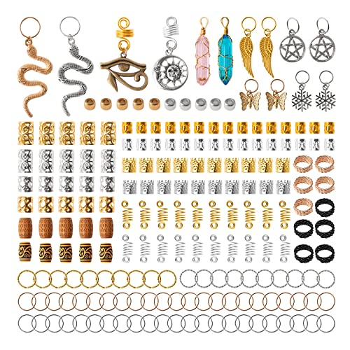 【Abundant Quantity】You will get 200pcs exquisite hair jewelry (30 Mix Styles). 2x Pure natural crystal gem pendants,12x dreadlock accessories pendants (snake, sun and moon, Egyptian Wedjat Eye of Horus, angel wings, lucky stars, snowflakes, and butterflies),76x braid rings (hair Rings, frosted ring, black/gold layered hair cuff ring),70x hair accessories cuffs gold/silver (mixed patterns and size),20x spring shape hairband gold/silver, 10x hollow polish hair beads gold/silver, 10x tube beads
