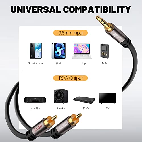 Universal Compatibility: This 3.5mm to 2 RCA stereo cable helps you plug the 3.5mm connector into the headset jack of your mobile device and the 2 RCA connector into the port of the audio system in a simple way. Compatible with iPhone, iPod, iPad, Car, MP3, CD player, laptop, tablet and other digital devices with 3.5mm audio jack and amplifiers or receivers with RCA jack.