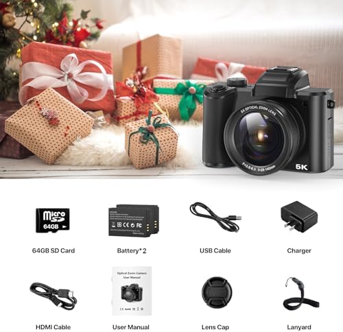 IDEAL GIFT& SERVICE: This compact travel digital camera features self-timer, pause function, continuous shooting, time-lapse, slow motion, motion detection, timing and various special effects. It also comes with 2*batteries and a 64GB SD card with a one-year warranty for all your needs. Whether you are documenting your life while traveling/school, showing off your photography on social media, or as a gift for family and friends, our 5K selfie camera is the perfect choice.