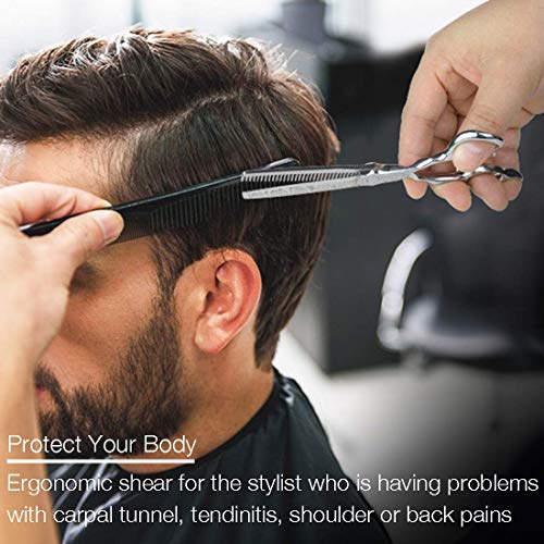 Ergonomic, Balanced Handle for Extreme Comfort – the highly ergonomic, balanced handle with provides maximum thinning scissor control and cutting comfort, offset handles easily fit the hand so the wrist, elbow, and shoulder do not tire easily when opening or closing the hair cutting scissors, the advanced adjustment tension system is easily adjustable and precisely distributes tension from pivot to tip