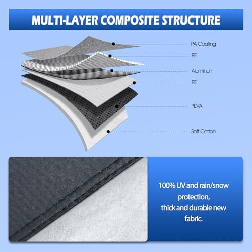 【High-Quality Material】iautaxesoriz car cover features a multi-layer composite material design. Layer 1 is PA coating, providing 100% waterproofing. Layers 2 consist of PE, enhancing breathability and maintaining suitable interior temperatures. Layer 3 is an aluminum membrane that reflects 99% of UV rays, reducing UV damage. Layers 4-5 are PEVA material, with strong tear resistance to maintain integrity in harsh weather. Layer 6 is soft cotton, effectively safeguarding the car’s paint.