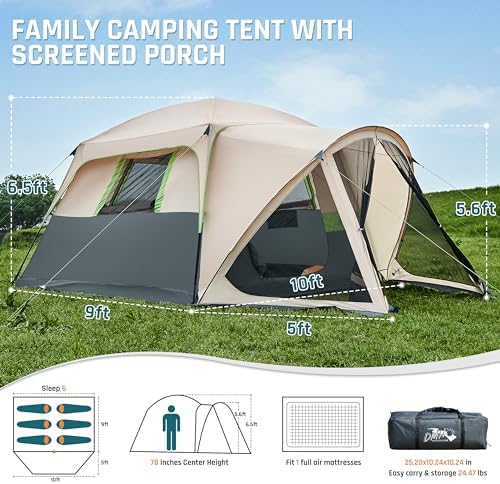 6 Person Camping Tent with Screen Porch, Family Tents for Camping, Water Resistant Large Cabin Tent, Dome Tent Includes Rainfly and Carry Bag, Easy Setup, Big Tent for Camping and Backyard