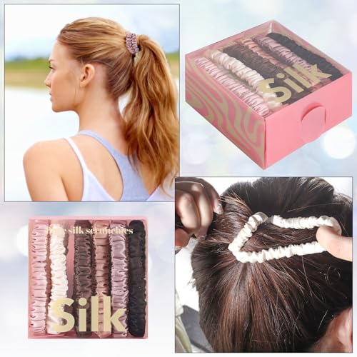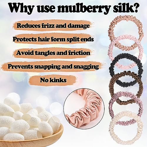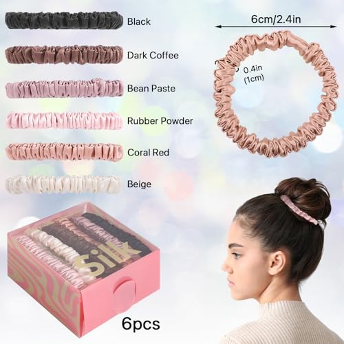 6Pcs Silk Hair Ties, Pure Mulberry Silk Hair Scrunchies No Damage Skinny Scrunchies Silk Ponytail Holder for Curly Thick Hair Women Girls Gift