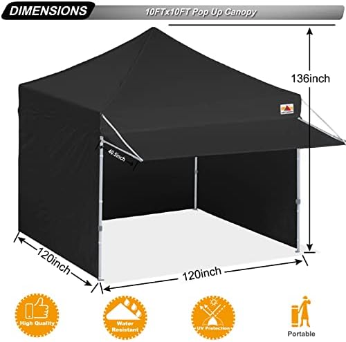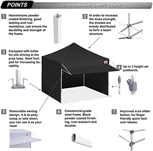 20% More Shade by the Awning: 10 feet by 10 feet with straight legs and 10’x10′ coverage at the top means you have more space with extra big awning: added about 23 square feet of ample cooling shade to your customers or friends. Provide hours of comforts and capture more attention from your customers.