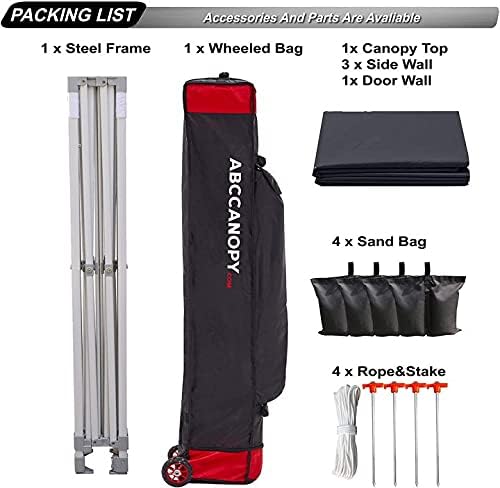 A Complete Set of Accessories: 1 x 10ft by 10ft pop up canopy top (100%waterproof), 4 x Sandbags, 3 x 10ft Sidewalls,1 x 10ft door wall, 1x 10ft upgrade awning with hardware. 1 x Roller Carry bag , 4 x Ropes ,4 x Stakes. One year after-sale protection for frame, six months after-sale protection for fabrics and accessories.