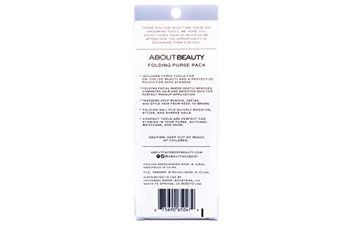 BEAUTY GROOMING KIT: Featuring a folding facial razor, square tip tweezers and a folding nail file, the About Beauty Folding Purse Pack is perfect for beauty touch-ups on the go.