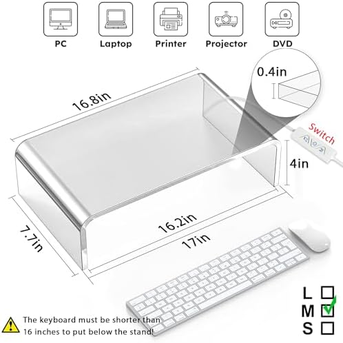 Acrylic Monitor Stand with LED Light – Acrylic Laptop Riser, Desktop Stand, Computer Monitor Stand for Desk, PC & TV Screen Riser, Aesthetic Monitor Riser for Office & Home, Keyboard Organizer, Clear