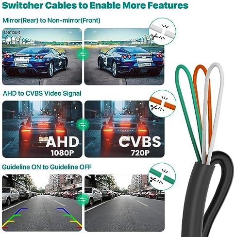 Three Switcher Cables Camera —Cut white cable to switch mirror image(rear view) to non-mirror image(front view). Cut orange cable to switch AHD video signal to CVBS video signal, its output video signal is AHD by default, if you need it to connect with a CVBS monitor, please cut the orange cable on the camera. Cut green cable to turn off the guide line. Please reconnect power supply after cutting any cable, you can also connect it back after cutting the cable if needed.