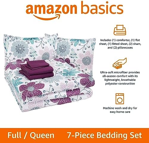 Amazon Basics Kid’s Easy Care Microfiber Bed-in-a-Bag 7-Piece Bedding Set, Full/Queen, Purple Flowers, Floral