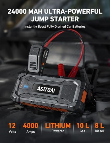 AstroAI S8 Ultra Jump Starter Battery Pack, 4000A Battery Jump Starter with Wall Charger for Up to 10.0L Gas & 8.0L Diesel Engines, 12V Portable Jump Box with 3 Modes Flashlight and Jumper Cable