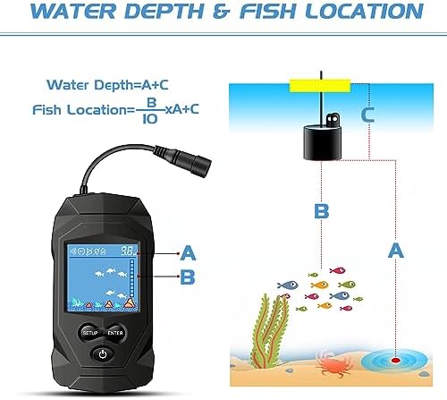 Water Depth Finder: The handheld fish finder has an fish and fish schools alarm function, when fish is detected, alarm will let you know at real-time. Depth Measurement Unit is selectable: FT/M. The portable fish finder powered by 4XAAA battery, and at power save mode, the water depth finder can work all day if you use new batteries.