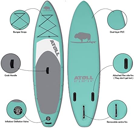 Atoll Inflatable Stand Up Paddle Board ISUP, Bravo Hand Pump and 3 Piece Paddle, Travel Backpack and Accessories New Leash Included Two Sizes – 11ft and 9ft