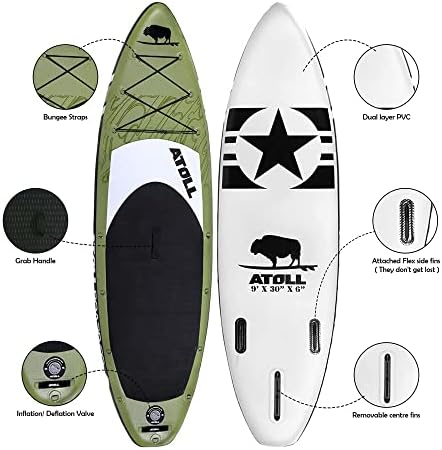 Atoll Inflatable Stand Up Paddle Board ISUP, Bravo Hand Pump and 3 Piece Paddle, Travel Backpack and Accessories New Leash Included Two Sizes – 11ft and 9ft