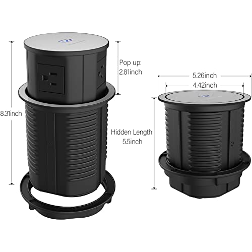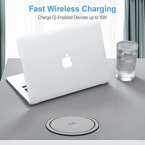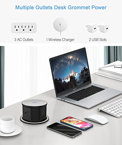 Countertop Pop up Outlet with Wireless Charger: Fully automatic retractable desktop design,this unique grommet power outlet get rid of hefty adapters and messy plugs. Ideal for charging multiple devices at the home/office/school.