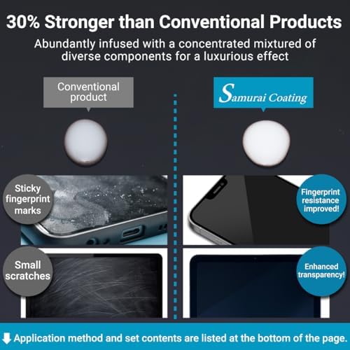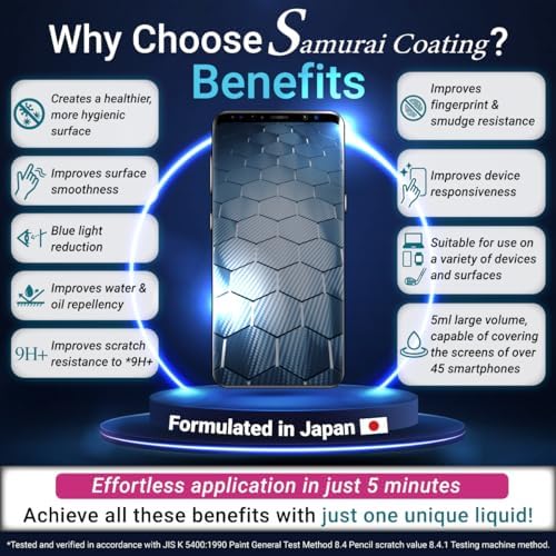 Samurai Coating’s unique blend of ingredients enhances strength by 30% compared to similar products. Compatible with all screen types, including curved and foldable displays. Does not interfere with cameras, front speakers, or fingerprint sensors.