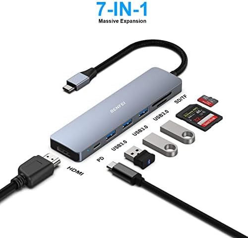 BENFEI 7in1 USB C Multiport Adapter with HDMI, SD/TF Card Reader, 3x USB 3.0, 60W Power Delivery, Compatible with iPhone 15 Pro/Max, MacBook, iPad Pro, iMac, S23, XPS17
