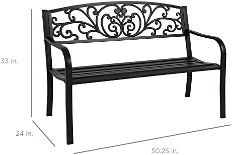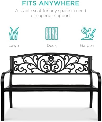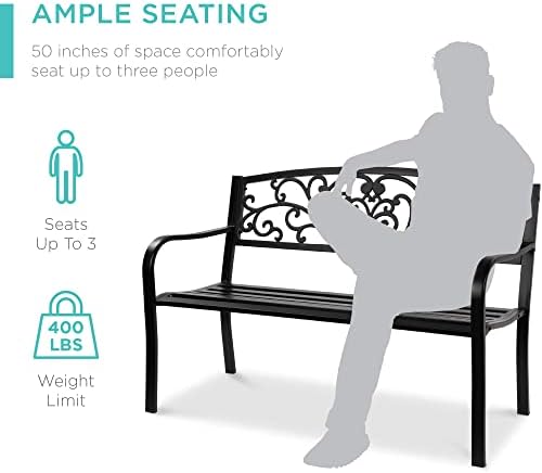 Best Choice Products Outdoor Bench Steel Garden Patio Porch Furniture for Lawn, Park, Deck w/Floral Design Backrest, Slatted Seat – Black