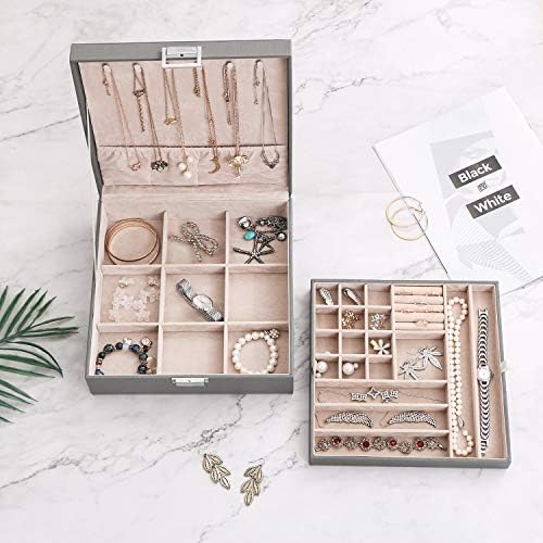 BEWISHOME Jewelry Box for Women 35 Compartments Jewelry Organizer – 6 Necklace Hooks, 2 Layers – Jewelry Boxes Display Storage Case Jewelry Holder for Girls Grey SSH71H
