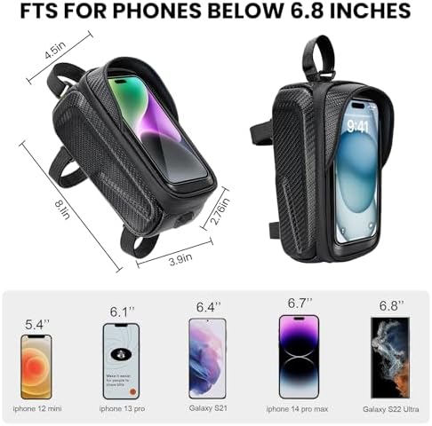 【𝐋𝐀𝐑𝐆𝐄 𝐂𝐀𝐏𝐀𝐂𝐈𝐓𝐘】: The bike bag has a very large capacity for storing not only your cell phone, but also other essentials such as keys, wallet, batteries, repair kit sunglasses or energy bars. It is also perfectly compatible with cell phones up to 6.5 inches, so you no longer have to compromise on what to carry while cycling.