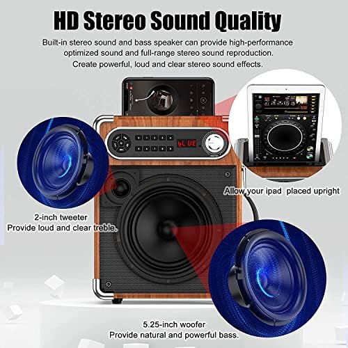 Multi-function Bluetooth Speaker: Built-in the latest Bluetooth 5.0 chip for wireless streaming ensures instant pairing and provides a more stable transmission and longer distance. This big speaker also supports a Micro TF card, Flash USB, and AUX-in connectivity. Compatible with the android mobile phone, TV, iPad, tablet, PC. There is a 6.35 microphone input on the operation panel, which also works for guitars. The unique groove design on the karaoke machine allows you to place your phone.