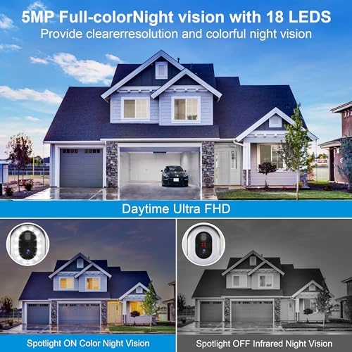 [5MP Ultra HD Night Vision] New upgrade 5 megapixel, provides 4K full HD. BondFree solar camera take a 355° horizontally and 90° vertically panoramic shooting and 4X digital zoom, make sure cover your target area without blind spots. 3 night vision modes (full color, black and white, smart) for to choose. Built-in CMOS sensor and 4 IR lights automatically sense ambient light and switch to color night vision mode, see clearer details and color images even in pitch dark up to 33ft!