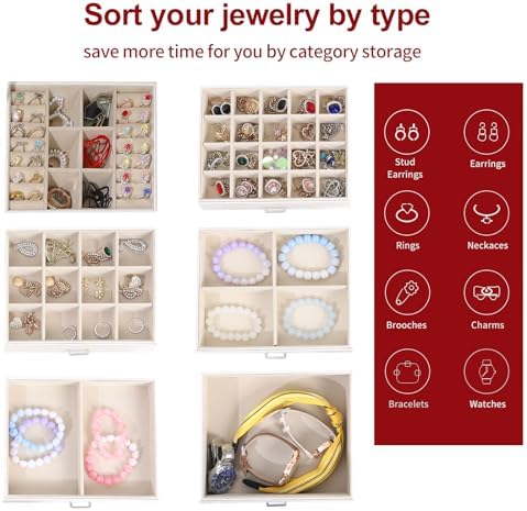 The large jewelry box includes earring boards, ring card slots, watch pillows and large drawers for glasses storage. Watches, necklaces, earrings, brooches, hair accessories, sunglasses, etc. can all be stored independently. Some partition boards can be moved and disassembled, and the flexible design allows you to adjust it according to your personal needs.